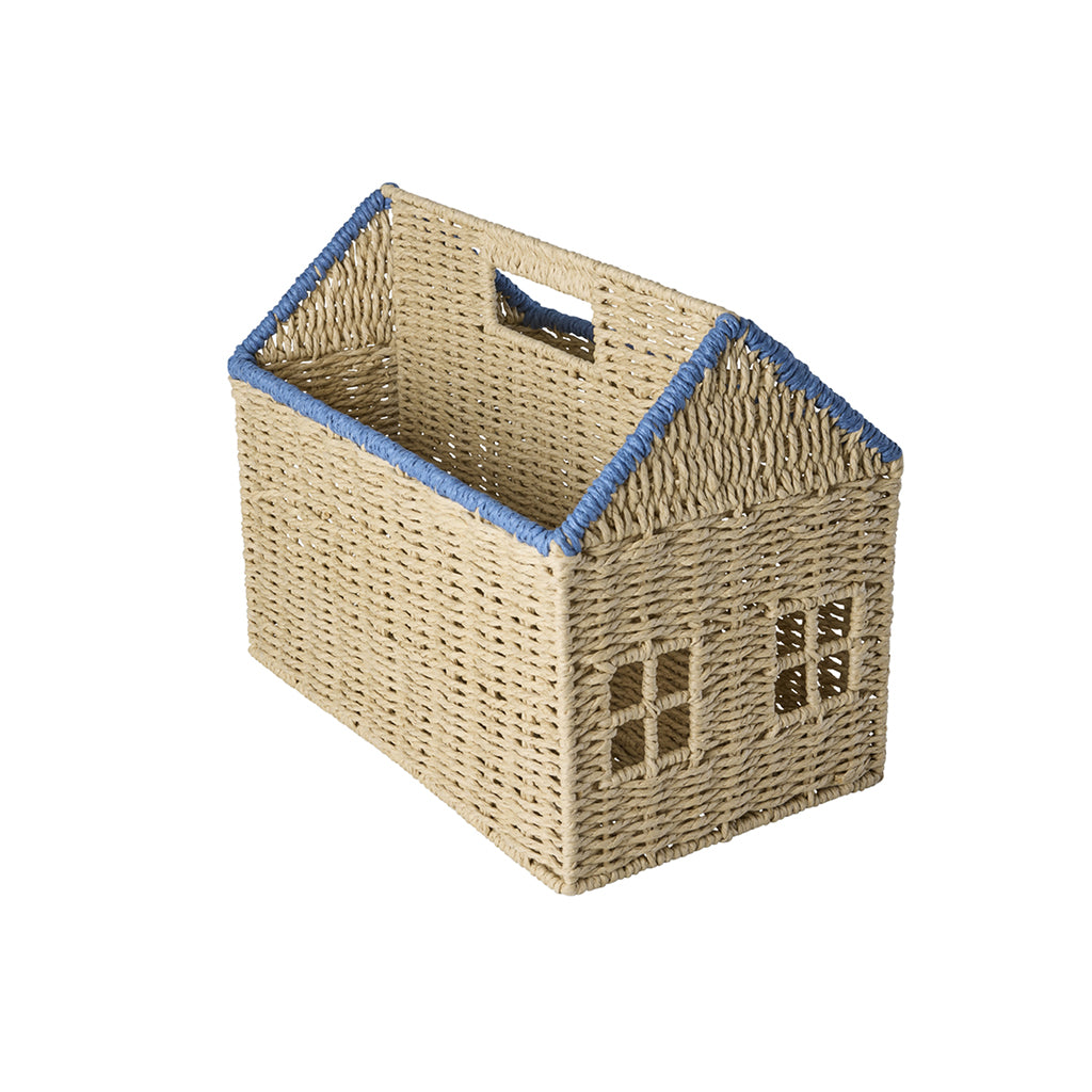 Fin förvaringskorg från Rice, utformad som ett litet hus som är perfekt för förvaring av barnböcker. Huset har en charmig design med mjuk rosa kant och små utskurna fönster, vilket ger ett lekfullt och mysigt uttryck som bjuder in till fantasi och sagoberättande.