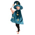 Snygg trollkarlskostym i petroleumfärgad velour med applikationer av guldstjärnor. Manteln stängs vid halsen med kardborreband, och med följer en stilig hög hatt samt en fin trollstav. Setet finns i storlek one-size för barn från 3-8 år.