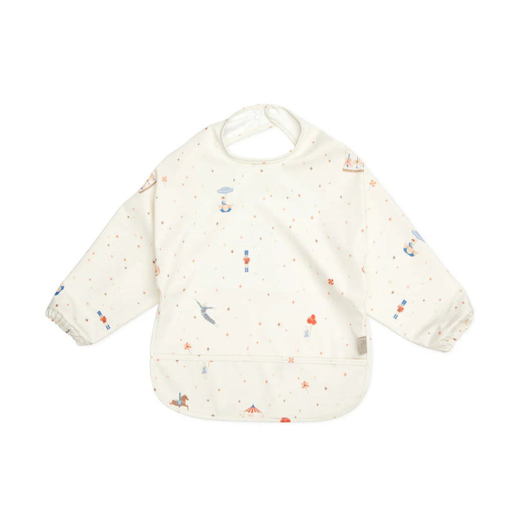 Praktisk heltäckande haklapp med ärmar från Cam Cam, perfekt när de små ska lära sig att äta själva eller för kreativ lek. Haklappen/förklädet stängs med tryckknapp i nacken och har öppen rygg samt ficka framtill. Tillverkad i återvunnen polyester, STANDARD 100 by OEKO-TEX®.