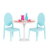 Ett vackert bord och högryggade stolar för dina Our Generation-dockor. Snygga blå stolar som passar perfekt till det kritvita bordet. Det medföljer dessutom vaser, bordsunderlägg, bestick och servetter. Från 3 år.