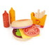 Träleksaksmat från Mentari. Stort hamburgerset i trä med olika delar för att samla en hel hamburgersmörgås. Komplett med hamburgarebröd, kött, ostskiva, tomat, lökring och sallad.