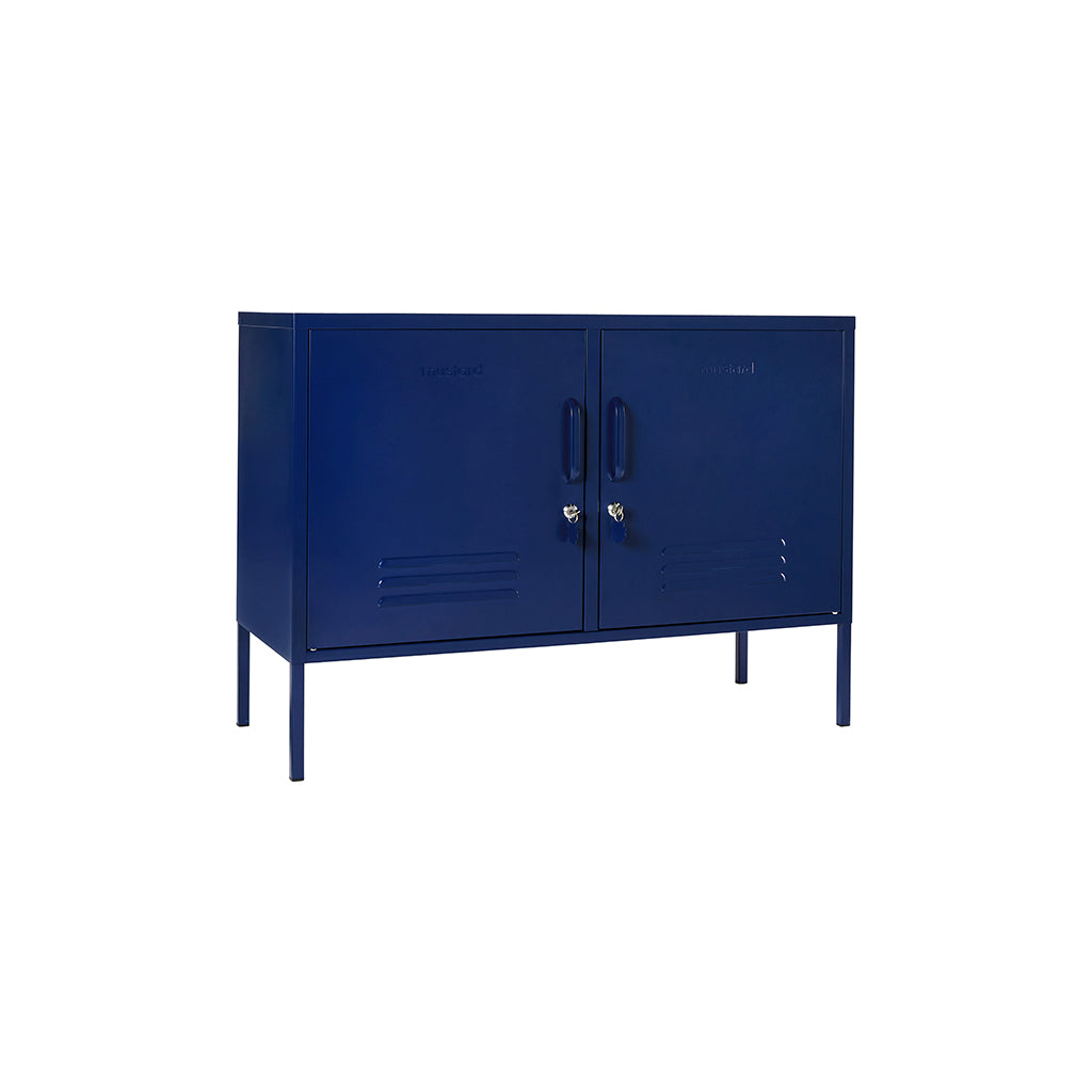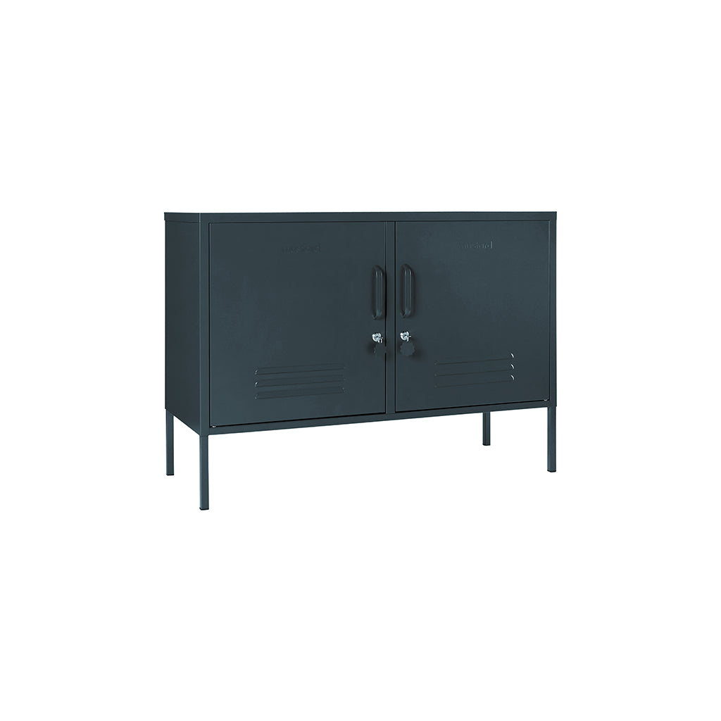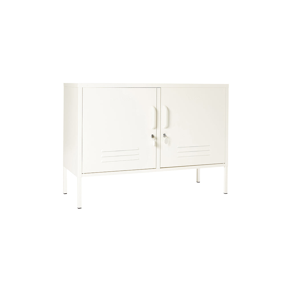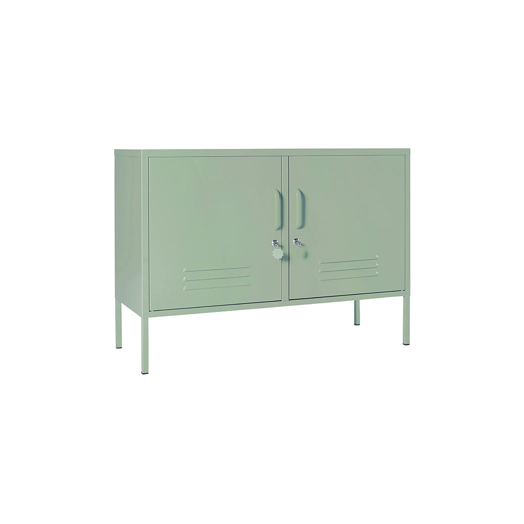 Med Lowdown metalskab från Mustard Made får du en flexibel möbel som fungerar lika bra som TV-bänk, ljudkonsol eller smart förvaring på kontoret. Det är idealiskt för mindre utrymmen men passar även perfekt i hall, lekrum eller sovrum. Två justerbara hyllor och krokar bakom dörrarna gör det enkelt att hålla ordning, och utsidan har praktiska detaljer som lås, handtag, kabeluttag samt en matt, magnetisk yta.