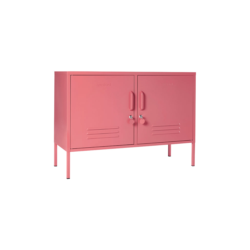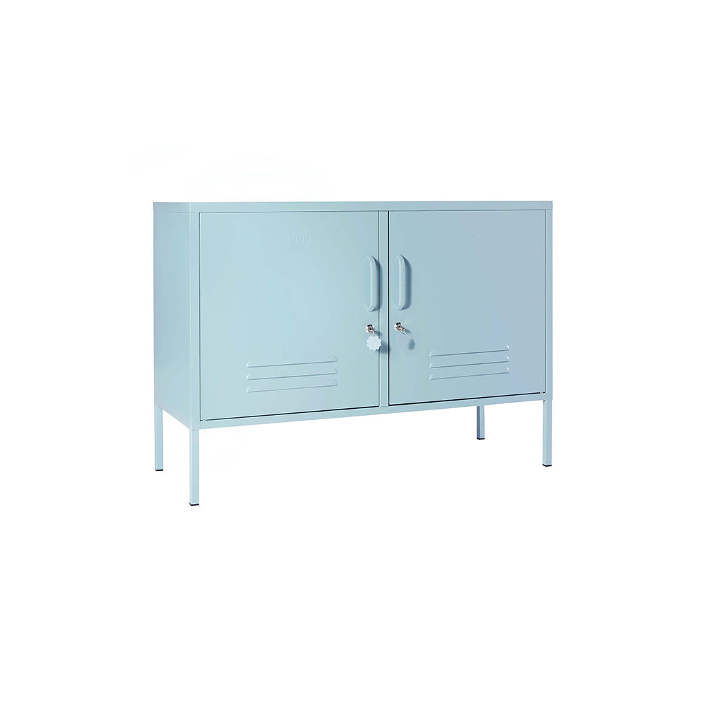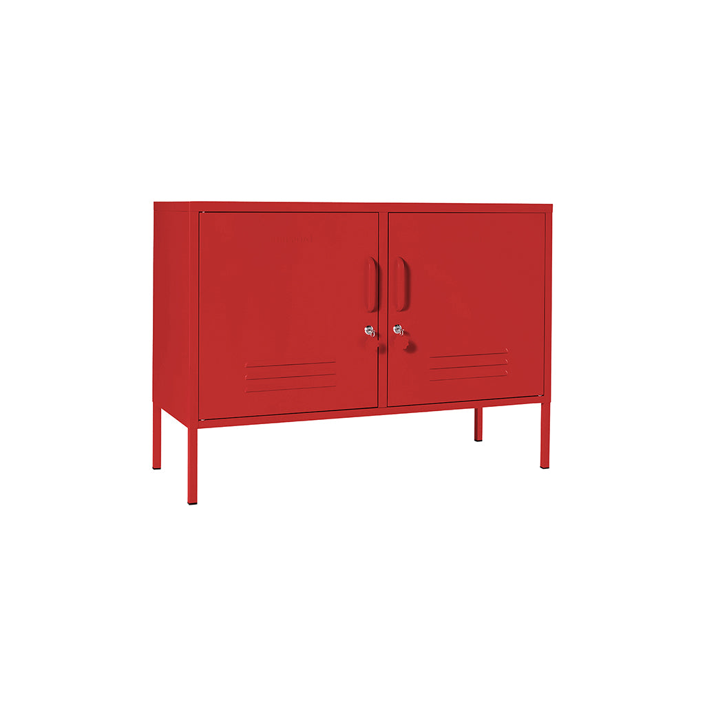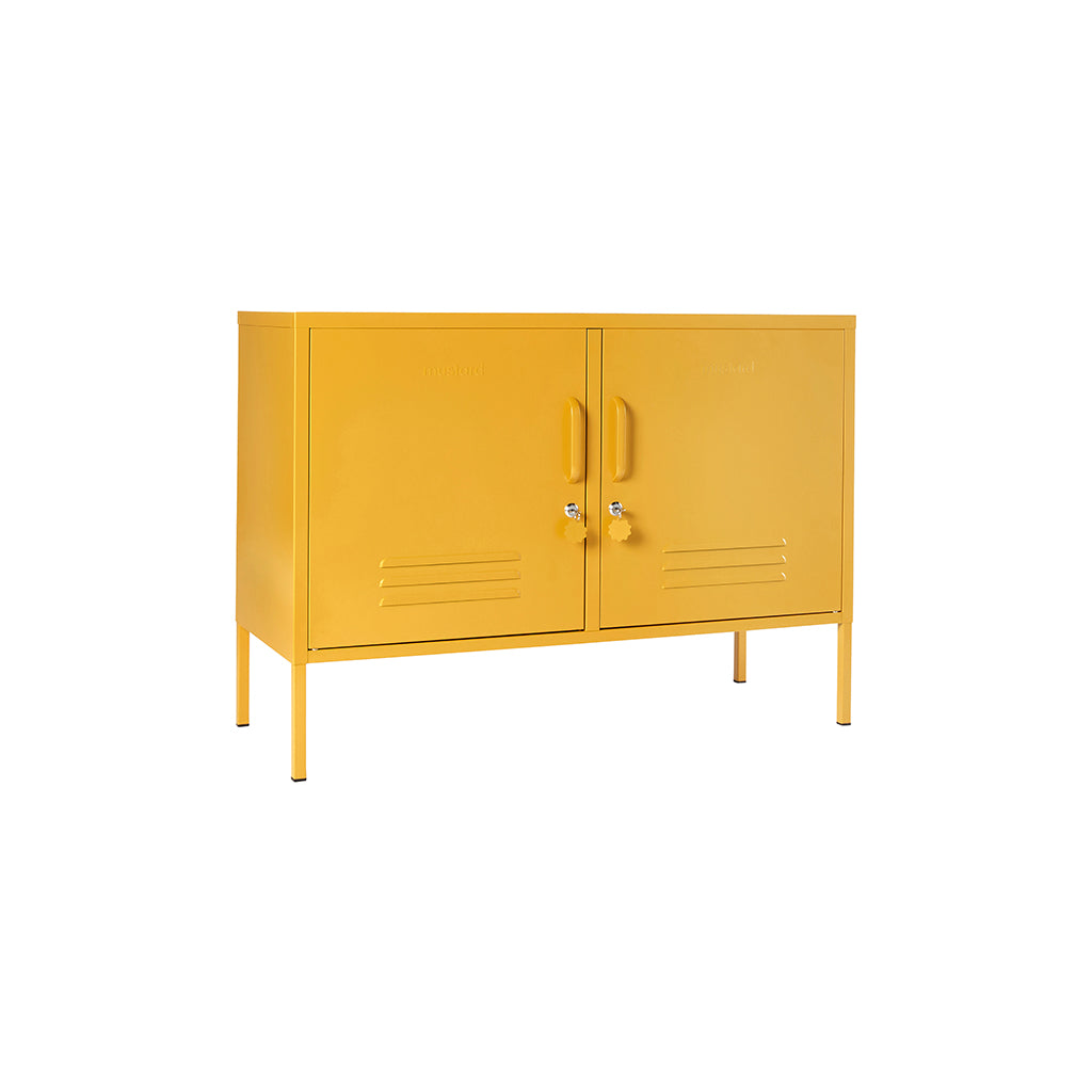 Med Lowdown metalskab från Mustard Made får du en flexibel möbel som fungerar lika bra som TV-bänk, ljudkonsol eller smart förvaring på kontoret. Det är idealiskt för mindre utrymmen men passar även perfekt i hall, lekrum eller sovrum. Två justerbara hyllor och krokar bakom dörrarna gör det enkelt att hålla ordning, och utsidan har praktiska detaljer som lås, handtag, kabeluttag samt en matt, magnetisk yta.