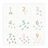 Motivet på ena sidan består av siffror och små element som uppmuntrar till att lära sig räkna och känna igen siffror, medan den andra sidan har ett fint och enkelt mönster med prickar.